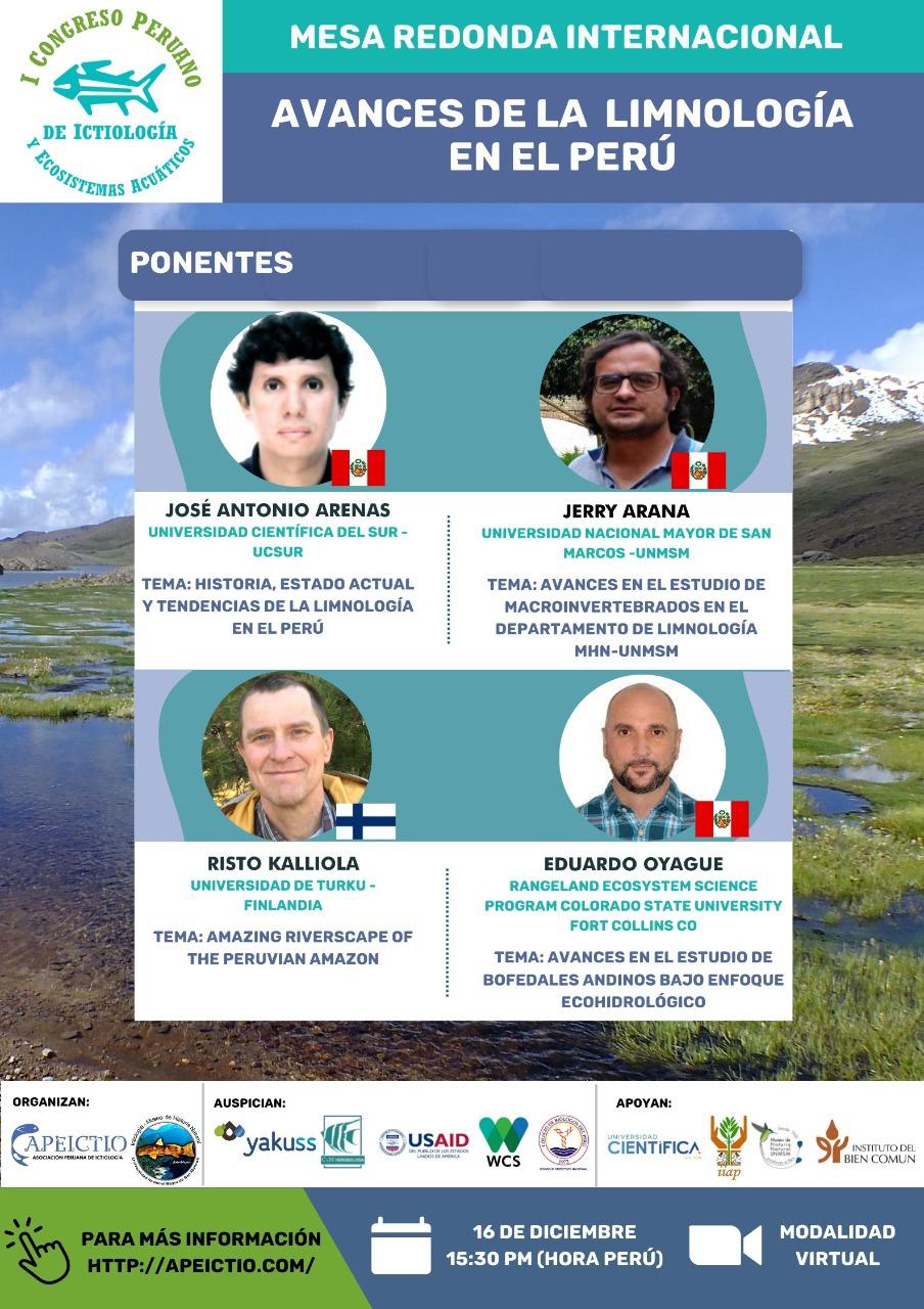 El Comité Organizador y el Comité Científico del Primer Congreso Peruano de Ictiología y Ecosistemas Acuáticos tienen el gusto de invitarles a este evento virtual que tendrá lugar entre el 15 y 17 de diciembre de 2022. El evento es una iniciativa de la Asociación Peruana de Ictiología (APEICTIO) y el departamento de Ictiología del MHN-USM, en colaboración con organizaciones y diversos auspiciadores nacionales e internacionales. Esta primera edición del congreso será dedicada al MSc. Hernán Ortega, docente e investigador de amplia trayectoria, cuyo aporte ha sido fundamental en el desarrollo de la ictiología en Perú, formando apasionados ictiólogos por más de tres décadas, quienes se desarrollan trabajando en diversos campos relacionados a los peces neotropicales.