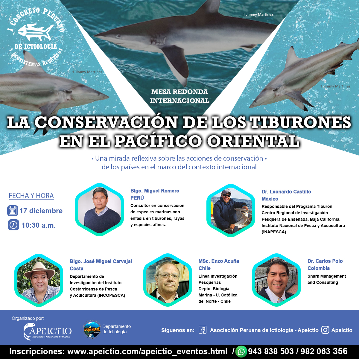 4. La Conservación de los tiburones en el Pacifico oriental: Una mirada reflexiva sobre las acciones de los países en el marco del contexto internacional. Esta mesa será liderada por el Blgo. Miguel Romero y contará con especialistas en este grupo a nivel de América.