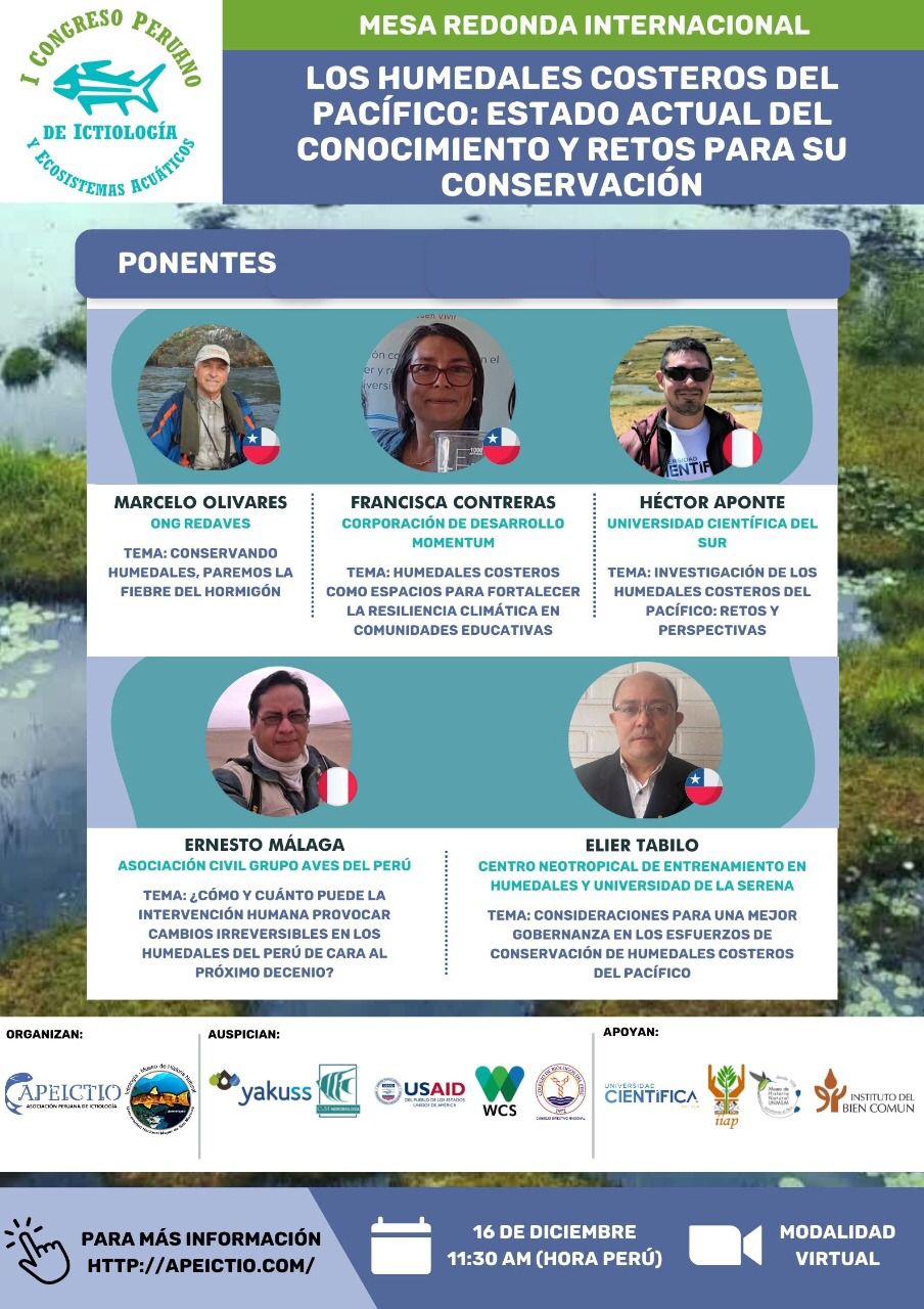 Esta mesa contará con la participación de los biólogos peruanos Dr. Hector Aponte, catedrático de la Universidad Científica del Sur y Ernesto Málaga Arenas de la Asociación Civil Grupo Aves del Peru, y los chilenos Marcelo Olivares Herrera (Naturalista y Gestor ambiental), M. Francisca Contreras Giancaspero (Ingeniera en Pesca y Magister en Gobierno y Gestión Pública) y el Dr. Elier Tabilo Valdivieso del Centro Neotropical de Entrenamiento en Humedales y Universidad de La Serena.